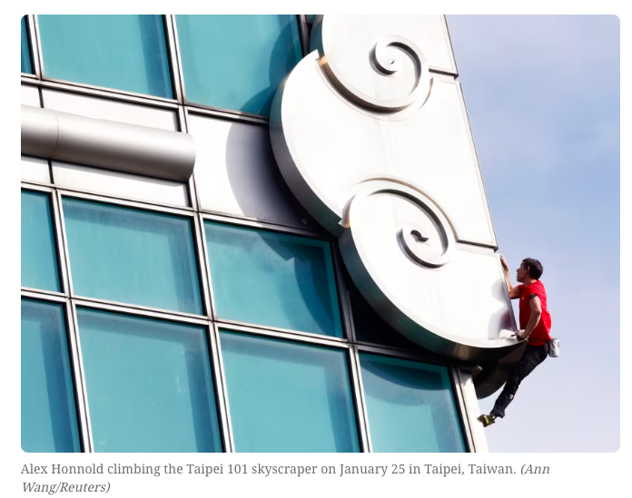 For 92 minutes on a clear Sunday morning in Taipei, thousands of spectators craned their necks as Alex Honnold undertook a feat never before attempted. At 10.43am local time, he reached the tip of the spire atop Taipei 101, 508 metres above ground, smiling and waving to the crowd below.